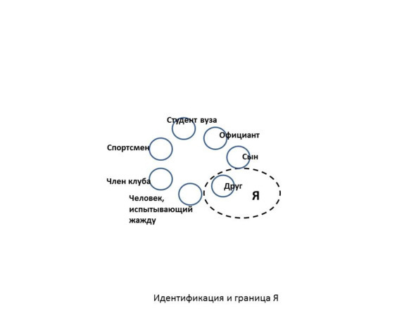 У Я есть «граница»: В гештальт-терапии говорится, что у Я есть граница. Как и в случае границы контакта, это конечно метафора. Она подразумевает, что то, с чем мы себя идентифицировали, не ограничивается нашим телом и может выходить далеко за его пределы, а может суживаться почти что до одной небольшой его части, например, больного зуба. Когда женщина осознает себя в роли матери, граница ее Я охватывает и ее детей, границы Я автомобилиста в момент вождения увеличиваются до размеров его автомобиля, когда мы искренне сопереживаем другому человеку, наше Я на время как бы становится с ним одним целым. Если женщина узнает, что кто-то обижает ее ребенка, она переживает это практически как нападение на саму себя. Мы можем отождествлять себя с семьей, национальностью, определенной страной. И тогда угроза этой группе воспринимается нами как угроза собственной самости. Граница может и суживаться. Если человек чувствует физическое недомогание, то его восприятие своего Я сокращается до отдельных телесных ощущений.