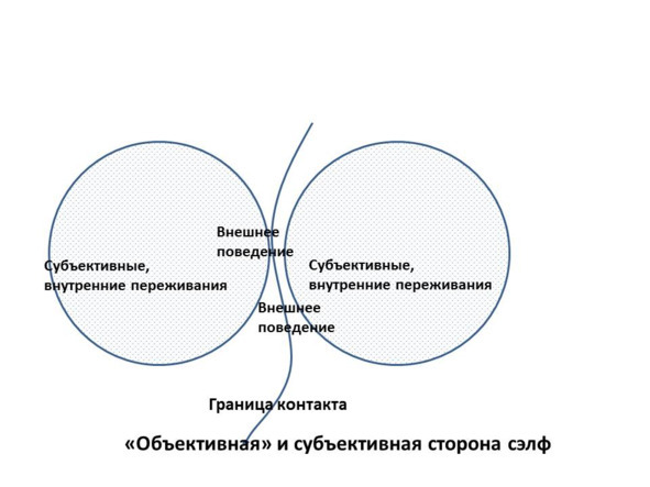 Поскольку Я связано с контактом, оно имеет свою субъективную и «объективную» стороны. Субъективная сторона – это то, как я внутри себя переживаю свою идентификацию в текущий момент времени (например, когда идентифицируюсь с телесными ощущениями или с социальной ролью). «Объективная» сторона – это то, как меня воспринимают другие люди в текущем контакте, например, с точки зрения социальной, профессиональной роли и т. д. Если молодой человек учится в вузе и одновременно работает в свободное от учебы время, то когда он приходит в ресторан и надевает форму официанта, окружающие его воспринимают как официанта. Когда он приходит на занятия в медицинский университет и надевает белый халат, его воспринимают как студента и будущего врача. Когда после учебы он приходит в компанию, его воспринимают как друга, а другие роли в это время уходят на задний план, становятся фоном.