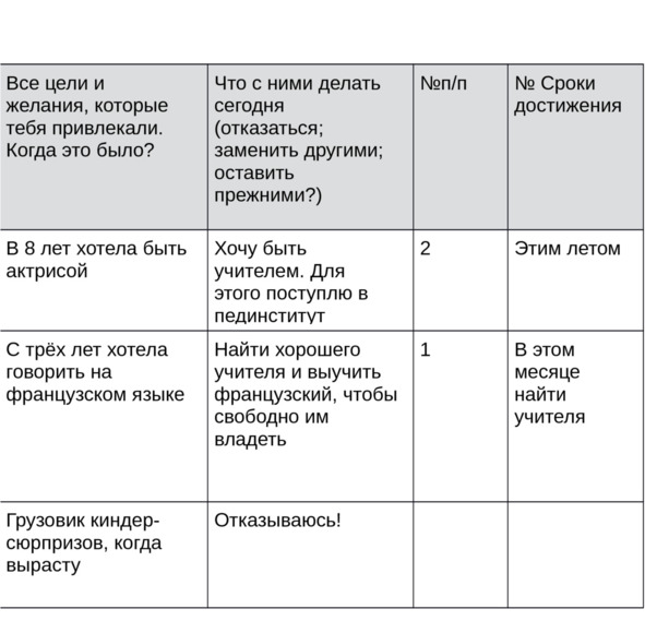 Проанализировав, как она могла бы использовать полученные для профессии актрисы знания и навыки, она стала учителем французской литературы. Позже, будучи серьёзным профессионалом и любимой учительницей у своих учеников, она говорила: «Я этому бесконечно рада, потому что в работе учителя гораздо больше условий для творчества – ты здесь и сценарист, и режиссёр, и актёр». Таким образом нужно использовать уже забытую мечту для создания новой и актуальной. Впишите преобразованные цели в следующий столбик.