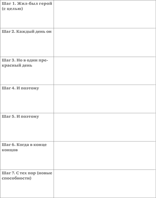 История — конвертируемая валюта на все времена. Умение рассказывать истории напрямую влияет на вашу рыночную стоимость. Умение рассказывать истории — это еще и умение упаковывать идеи, которые мы с вами уже успели разработать, выполняя предыдущие упражнения. Так давайте научимся их рассказывать. Тем более что благодаря Pixar у нас есть для этого удивительно простое упражнение, которому мне удалось научиться у мультипликатора этой прославленной студии.