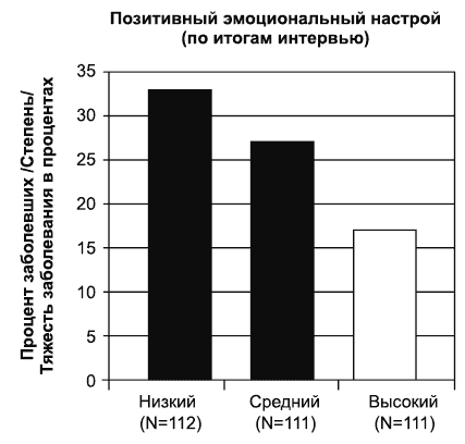 Люди, которые демонстрировали больше позитивных эмоций до ингаляции риновируса, реже заболевали простудой {23}, чем люди со средним уровнем позитивных эмоций. А те, в свою очередь, болели реже, чем испытуемые с низким уровнем позитивных эмоций.