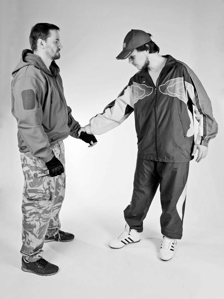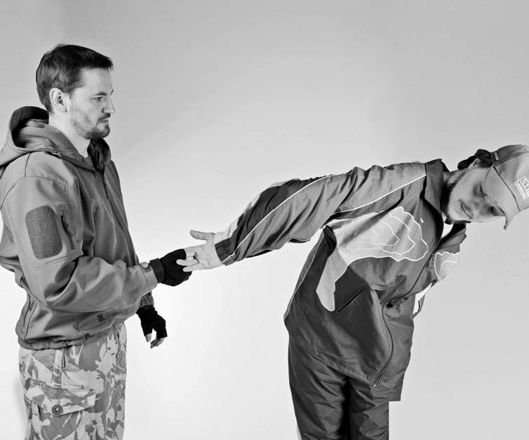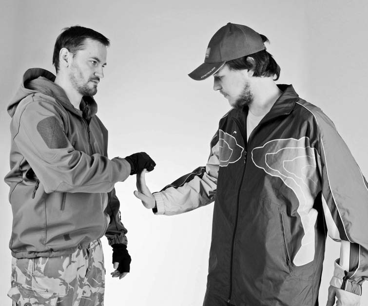 Берем пальцы противника в горсть и поднимаем, как бы стараясь перегнуть их назад, чтобы ногти коснулись запястья. Давить надо не в сторону запястья, а вниз, к костяшкам (фото 13).