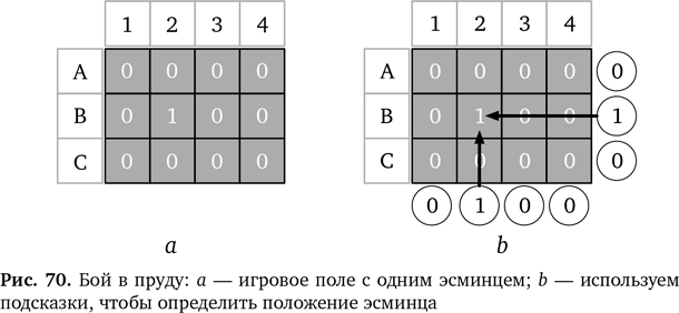 Да, такой способ есть, но только если противник даст вам кое-какие простые подсказки. Тогда вы сможете догадаться. Во-первых, нужно, чтобы второй игрок сложил значения клеток в каждой строке и сообщил их. Для ситуации как на рис. 70a информация будет такой: 0 в строке A (потому что там 0 + 0 + 0 + 0, хотя вам скажут только про 0 в сумме), 1 в строке B (потому что там 0 + 1 + 0 + 0) и 0 в строке С. Это начало. Теперь вы знаете, что корабль находится в строке B, но не знаете, где именно. Теперь спросите, какая сумма получается в каждом столбце. В столбце 1 выходит 0, в столбце 2 — 1, в столбце 3 — 0 и в столбце 4 — 0. Теперь вы знаете, что корабль находится в столбце 2. Это показано на рис. 70b, где подсказки расположены в кружочках по краям игрового поля. Обобщив эту информацию, вы поймете, что корабль находится в клетке В2, и — БАБАХ! — он потоплен!