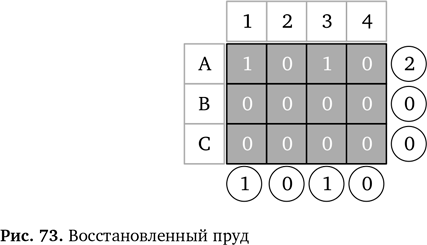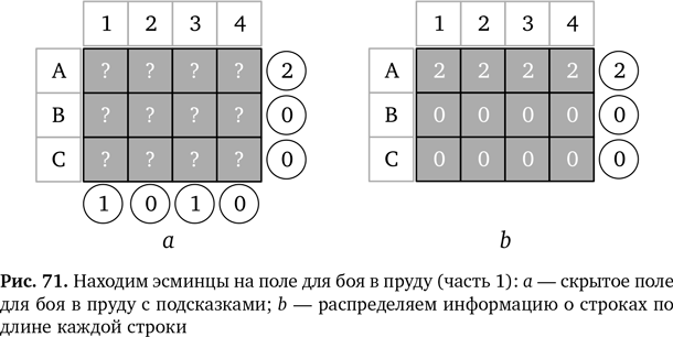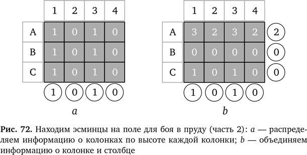 Мы знаем, что в столбцах 1 и 3 что-то есть, но не знаем, где именно. Чтобы окончательно решить эту задачу и восстановить расположение кораблей, мы просто складываем эти сетки с распределенной информацией вместе и получаем сетку как на рис. 72b.