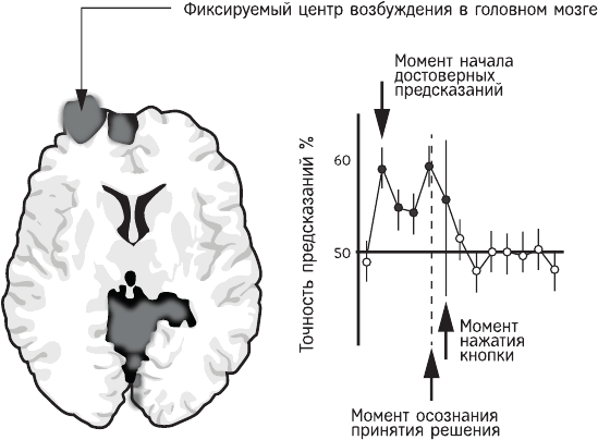 В хрестоматийном теперь эксперименте Либета было показано: нейронная активность мозга, свидетельствующая о том, что он уже принял то или иное решение, примерно на полсекунды опережает наше как бы собственное, сознательное решение.