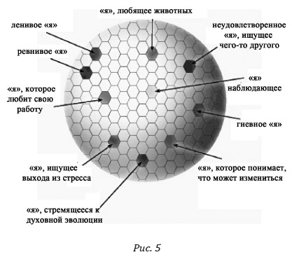 В духовной психологии человек изображается как круг, поверхность которого разделена горизонтальными и вертикальными линиями на тысячу маленьких квадратов (987 возможных комбинаций черт характера, возникающих в результате деления центров). Каждый из этих квадратов представляет одно маленькое я: вспыльчивое я; любящее я; ревнивое я; горделивое я; я, которое хочет быть правым; всегда усталое я; храброе я; сомневающееся я; ленивое я; я, боящееся заболеть; любящее спорить я или, наоборот, старающееся избегать конфликтов; я, любящее быть на хорошем счету у других и т. д.