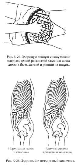 Здоровую топкую кишку можно накрыть одной раскрытой ладонью (рис. 5-25). Она должна быть ровной и мягкой на ощупь, легко и безболезненно перемещаться, проникновение пальцев не вызывает каких бы то ни было рефлекторных мышечных реакций. При ослаблении нажима кишка должна сразу возвращаться в свое обычное положение. Облегченная тонкая кишка будет твердой на ощупь, и вы обычно сразу же сможете почувствовать очень сильный пульс аорты. Форма расслабленной и обессиленной тонкой кишки неровная, и в пей чувствуются пузырьки газа или жидкости. Часто некоторые участки тонкой кишки бывают слишком натянутыми, другие ослабленными.