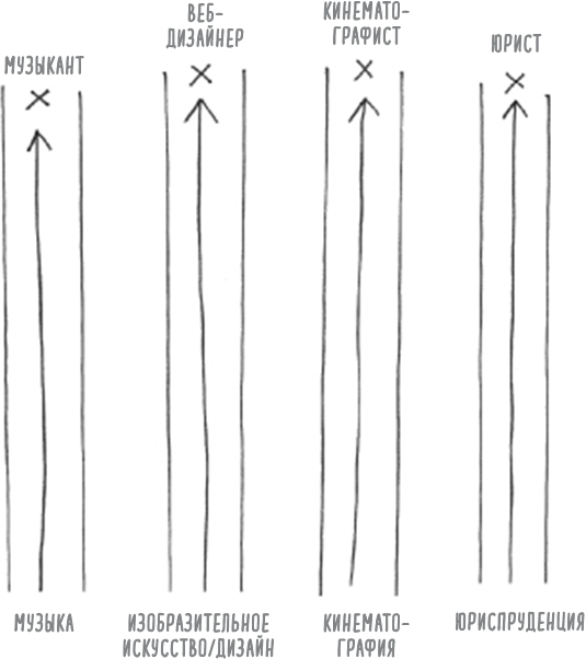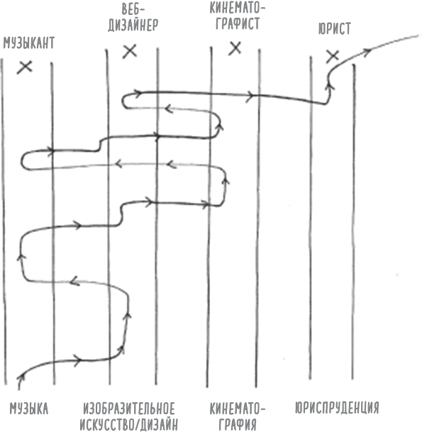 Приведу в качестве примера мой собственный путь (см. рис. на стр 26). Музыка, изобразительное искусство, кино и юриспруденция – вот четыре области, которыми я занималась либо профессионально, либо академически/теоретически. Рассмотрим вертикальную траекторию каждой сферы.
