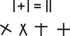 Посмотрим на рисунок ниже. На нем изображены две равные линии. Мы понимаем, что 1 + 1 = 2. Это если смотреть с точки зрения «границ» и «краев». Но если перейти на точку зрения «зоны» и «поверхности», можно сосчитать фигуры равной ширины, при этом увидев их три (одна белая, между черными). Итак, 1 + 1 = 3. Далее, из двух полосок, если одну горизонтально положить на другую, мы получим четыре конца, так что 1 + 1 = 4. При должном воображении можно увидеть также четыре прямоугольника, четыре треугольника и четыре квадрата. Сдвигая центры фигур и углы, мы делаем фигуры неравными. Так или иначе, оказывается, что одна линия плюс одна линия в результате дают множество значений.