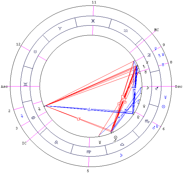 На рис. 22 транзитная Луна образует соединение с натальным Марсом и Солнцем, а поскольку последние образуют квадратуру с Юпитером, Нептуном и Сатурном, тем самым транзитная Луна "включает" натальный Т-квадрат Юпитер - (Марс-Солнце) - (Сатурн-Нептун). Одновременно активизируется секстиль (Марс-Солнце) - Луна.