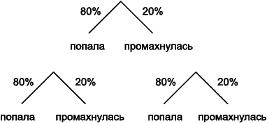 Посмотрим, какие стрелочки ведут к процентам пораженных мишеней. Мы учитываем два попадания подряд, попадание и промах, промах и попадание, но не учитываем два промаха. Поэтому мы умножаем вероятности вдоль трех первых стрелок и складываем результаты.