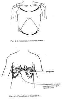 k. Используя четыре пальца руки, расслабьте диафрагму в области грудины (рис. 6-9). Вы можете менять способ использования пальцев, пока не найдете наиболее подходящий для вашей руки, что позволит вам справиться с этой работой. Знание различных пальцевых техник даст вам возможность выбирать наиболее подходящую для тела своего пациента - худощавого, мускулистого, тучного, хрупкого и т. д.