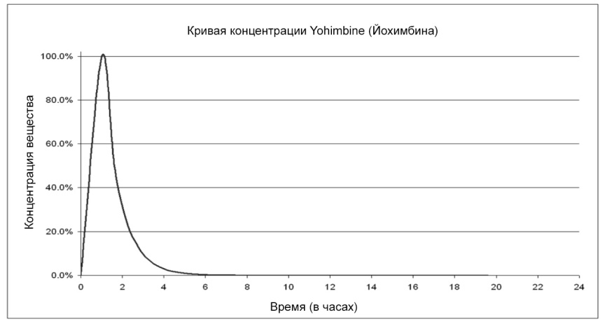 Кривая концентрации: Йохимбин быстро абсорбируется телом и имеет короткий период полувыведения. Максимальное значение в плазме достигается уже через час после приема и он практически полностью выводится из организма всего через 5 часов.