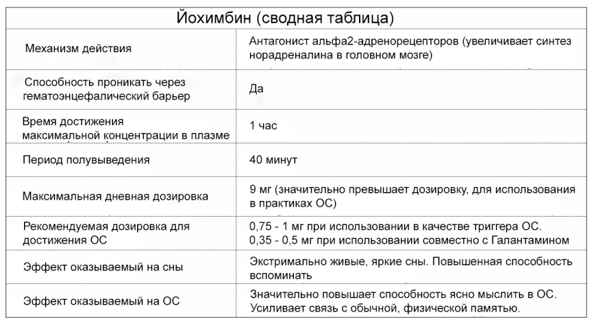 Резюме: Йохимбин является альфа2 антагонистом, что означает что он может повышать уровень норадреналина в головном мозге. Типичная рекомендованная дозировка, в 20-25 раз превышает дозировку для практикующих ОС, так что требуется делить таблетку на маленькие кусочки. Йохимбин может использоваться в качестве триггера ОС в дозировке около 1 мг, но это очень близко к дозировке вызывающей бессонницу. Использование 0,5 мг совместно с Галантамином способно вызывать ОС с крайне высоким уровнем осознанности. Эта комбинация, больше всего подходит тем, кто ищет силу и знания в ОС. Так же эта комбинация делает ваши физические воспоминания более доступными в мире снов (вы способны получить доступ к вашей обычной, повседневной памяти).