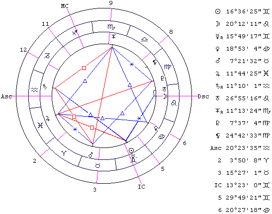 Замечательный, можно сказать, идеальный гороскоп. Посмотрите, как много красивых аспектных конфигураций - от Большого трина до Т-квадрата. При этом нет поврежденных планет, все планеты имеют гармоничные аспекты, большинство планет имеет и гаромоничные, и напряженные аспекты - самый лучший вариант. Одним словом, живи и радуйся. Что и происходило в реальности.