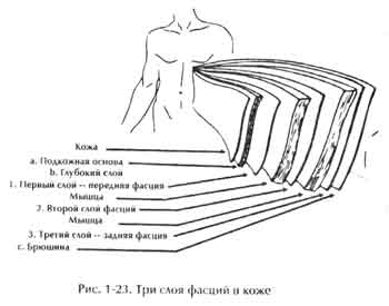 Фасции представляют собой ткани, которые образуют защитные слои вокруг каждого органа. Для обеспечения свободного течения энергии они должны быть влажными. Любая часть тела содержит фасции различной толщины и прочности, они окружают более мягкие и более нежные органы. Медицинские книги приводят перечни ста двадцати различных типов фасций. Глубинные и поверхностные фасции поддерживают кожу, мышцы, кости и внутренние органы, обеспечивая их защиту и смазку (рис. 1-23).