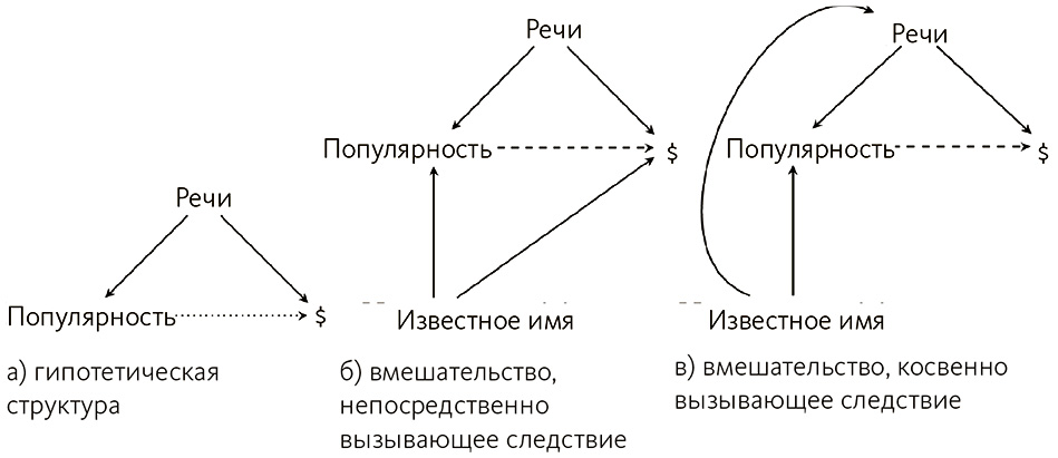 К примеру, в одном случае речи кандидата от политической партии могут привести одновременно к росту его популярности и пожертвований на проведение кампании, а в другом изменится только популярность, которая затем приведет к увеличению взносов. Имея возможность манипулировать благотворительными дарами и популярностью независимо друг от друга, мы могли бы с легкостью провести различие между двумя возможностями.