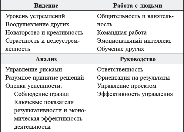 Мой опыт работы консультантом в компаниях самых разных отраслей показывает, что многие из них оценивают своих лидеров и рабочую силу по сеткам компетентности. Похоже, что способ измерения потенциала и уровня исполнения нужен практически всем. На следующей странице приведен пример такой сетки, где перечисляются компетенции сотрудников (таблица 1.1).