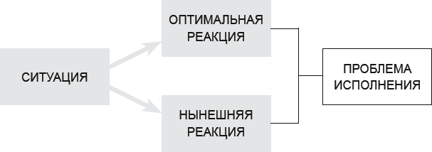 Сразу после этого озарения я стала различать подобное явление повсюду. Оказывается, большинство людей находят несоответствие между знанием того, что им следует говорить и делать, чтобы вести себя успешно, – своей оптимальной реакцией – и тем, как они действительно поступают в повседневной жизни, – своей нынешней реакцией. Я называю это явление «проблемой исполнения» (рисунок 1.1).