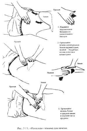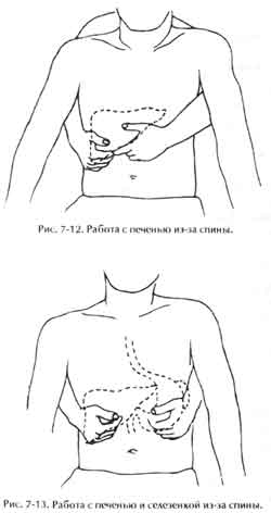 b. Используйте ту же технику для одновременной работы с печенью и селезенкой. Ил этого же положения можно выполнять массаж любых органов брюшной области (рис. 7-13).