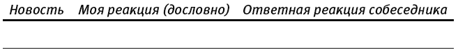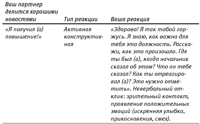 Ваше задание на следующую неделю: внимательно слушайте любимого человека каждый раз, когда он делится хорошими новостями. Старайтесь реагировать активно и конструктивно. Просите его рассказать, как все произошло. Чем дольше он рассказывает, тем лучше. Отвечайте распространенно. (Не будьте лаконичны.) Всю неделю вам предстоит охотиться за хорошими новостями и каждый вечер заполнять следующую таблицу:
