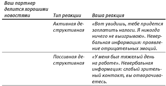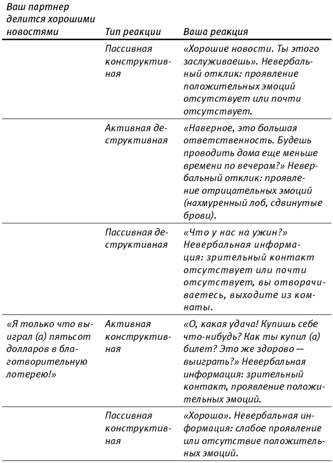 Как ни странно, семейные психологи обычно учат супругов получше ссориться. Чтобы совершенно невыносимый брак стал чуть более сносным. Неплохо. Однако задача позитивной психологии – превратить хорошие отношения в отличные. Шелли Гейбл, профессор психологии Калифорнийского университета в Санта-Барбаре, уверена: то, как вы радуетесь, говорит о ваших отношениях больше, чем то, как вы ссоритесь {16}. Люди, которых мы любим, часто рассказывают нам о своих победах, триумфах и мелких удачах. Наша реакция или укрепляет отношения, или подрывает их. Существует четыре основных типа реакции, и на пользу отношениям идет только один из них.