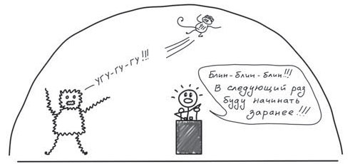 Оставшись наедине с пультом управления, рациональный тип сосредоточенно справляется с задачами (сделать это вовремя ему не позволяла обезьянка), после чего наступает короткий промежуток времени, когда панический монстр уже ушел, а обезьянка еще не появилась. В этот момент мы можем надавать себе множество несбыточных обещаний (типа «Я буду учиться с первого дня нового семестра»), но этот период довольно быстро проходит.