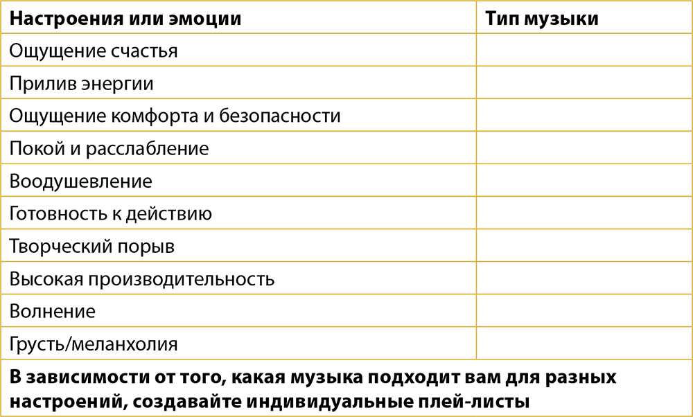 Заполните таблицу: укажите, какая музыка вызывает у вас соответствующее настроение. Можете добавить дополнительные строки, чтобы описать те эмоции, которые не вошли в таблицу.