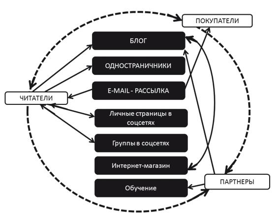Ниже приведена схема построения бизнеса в Интернете. Важно, чтобы все ваши интернет-ресурсы были привлекательными для читателей.