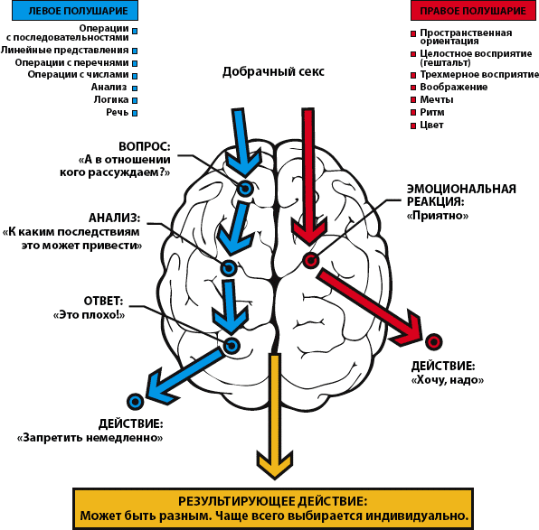 Когда работает только правое (эмоциональное) полушарие, мужчина одобрительно относится к добрачному сексу (красная линия). Это и понятно: «добрачный секс» – эмоциональная реакция: «приятно». Действие: «хочу, надо».