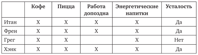 Таблица 5.1. Применив метод согласованности Милля, мы обнаруживаем, что энергетические напитки вызывают головную боль