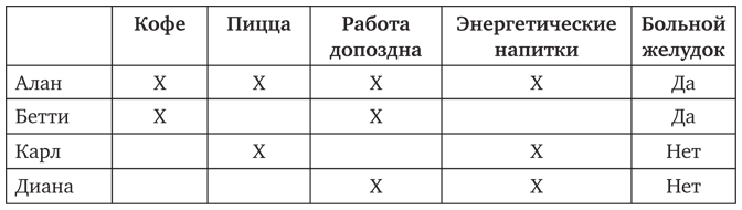 Скажем, группа программистов устраивает хакерский марафон. Компьютерщики, обожающие работать по ночам, вряд ли могут похвастаться сбалансированной и здоровой диетой, так что многие из них, чтобы продержаться до рассвета, сидят на крепком кофе, пицце и энергетических напитках. К несчастью, на следующий день, когда раздают награды, многие члены команды оказываются больны или по какой-то причине не выходят на связь. Как определить, какие факторы вызвали недомогание?