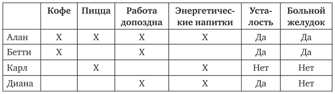 В некоторых ситуациях достаточно выяснить различие между причинами, которые привели к каждой болезни. К примеру, из табл. 5.4 мы знаем, что бодрствование по ночам порождает усталость. Итак, то, что Алан, Бетти и Диана устали, объясняется ночным бдением за компьютером. Тогда можно просто взглянуть, в чем сходство и различие в случаях с больным желудком (избыточное потребление кофе), предположив, что должно быть что-то еще, вызывающее подобное недомогание, поскольку неизвестно, повинно ли в этом отсутствие ночного сна.