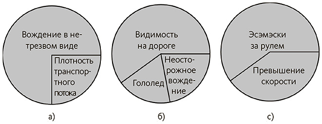 Секторная диаграмма причинно-следственных связей – группа факторов, достаточных для возникновения следствия, которая содержит все необходимые для этого компоненты. На рис. 5.2 изображены такие диаграммы для всех трех примеров с вождением.