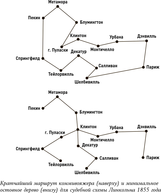 Например, вы можете ослабить задачу о коммивояжере, если позволите ему посетить один и тот же город несколько раз и возвращаться бесплатно. Поиск кратчайшего маршрута в этих новых ослабленных условиях приводит к тому, что называется «минимальное остовное дерево». (Если хотите, можете принять минимальное остовное дерево за наименьшее количество километров дорог, соединяющих один город с другим. Кратчайший путь коммивояжера и минимальное остовное дерево для судебной схемы Линкольна показаны ниже.) Как оказалось, на решение этой ослабленной задачи компьютеру не требуется времени вовсе. И в то время как минимальное остовное дерево не обязательно ведет прямо к решению реальной задачи, оно тем не менее весьма полезно. С одной стороны, остовное дерево с его свободным механизмом возврата никогда не заменит реального решения, которое должно следовать всем правилам. Таким образом, мы можем принять ослабленную задачу – фантазию – за нижнюю границу реальности. Вычислив, что остовное дерево расстояний между определенными городами – это 100 миль, мы можем быть уверены, что расстояние, покрытое коммивояжером, не будет меньше этого значения. И если мы найдем, к примеру, маршрут расстоянием в 110 миль, он будет не более чем на 10 % длиннее оптимального решения. Таким образом, мы можем получить представление о том, насколько близко мы подошли к настоящему решению, даже не зная, какое оно.