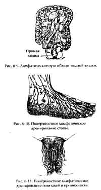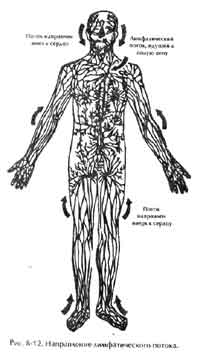 Система лимфатического дренирования организма покрывает все тело (рис. 8-10, 8-11 и 8-12). Лимфатическая жидкость из брюшной полости, нижней части тела и ног поступает в цистерну трудно го протока (в нижней части брюшной полости, перед первым и вторым поясничными позвонками), откуда она перетекает в грудной лимфатический проток. Здесь эта лимфа соединяется с лимфой, поступающей от левой стороны головы, шеи и грудной клетки. В правый лимфатический проток поступает лимфа из правой верхней части тела ц от правой стороны головы и шеи.
