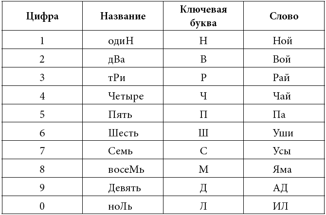 При вспоминании по слову «НиЛ» отыскиваем ключевые буквы «Н», «Л» и по ним определяем число «10». Для простоты сведем все в табл. 18 (ключевые буквы – прописные).