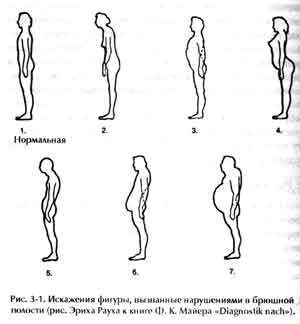 Люди с сильной мускулатурой, у которых имеются проблемы в верхней части брюшной полости, склонны увеличивать пространство для болезненной части кишечника, отводя бедра вниз и сильнее сгибая поясницу. Поскольку при этом естественный изгиб грудной клетки спрямляется, грудь выдастся вперед, шея напряженно отводится назад, а лопатки приближаются друг к другу. Такая осанка приводит к болям в пояснице и может стать причиной одышки (рис. 3-1, 3).