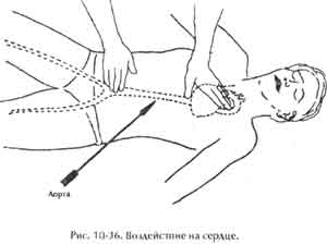 1. Положите правую руку (или, если вам больше нравится, левую) на аорту в области пупка. Рука будет перемещаться вместе с ударами пульса: она подпрыгивает, когда прыгает пульс, и ее движения ускоряются, когда пульс нарастает (рис. 10-36).