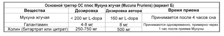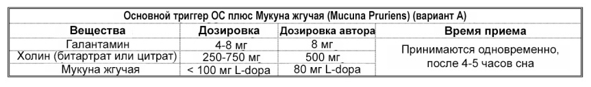 Мукуну жгучую можно принимать с любым из триггеров ОС, о которых я рассказывал ранее. Если вы собираетесь принять мукуну одновременно с триггером, принимайте ее в дозировке которая содержит меньше чем 100 мг L-dopa (см. Главу 11). Если вы хотите попробовать большую дозировку (100-200 мг L-dopa), принимайте ее примерно за час до приема основного триггера. Вы можете поспать или бодрствовать в течении этого часа (между приемами). В следующих таблицах я привел два варианта использования мукуны с основным триггером ОС.