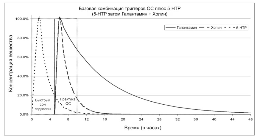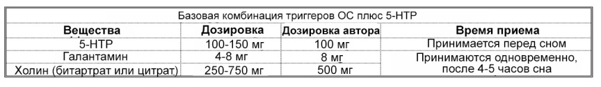 В следующей таблице показано, как 5-HTP может гармонично взаимодействовать с базовым триггером ОС. Оптимальной дозировкой для 5-HTP будет такая, после которой вы будете видеть яркие сны после 4-5 часов сна. Прием 5-HTP может предшествовать любой комбинации триггеров ОС.