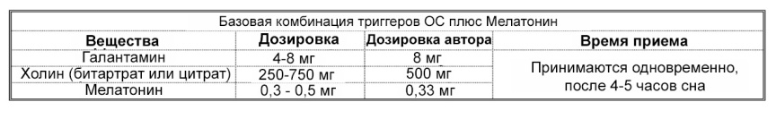 Если вы обнаружите, что после приема одной из комбинаций триггеров ОС вам трудно уснуть, вы можете принять немного Мелатонина. Мои исследования показали, что небольшая доза Мелатонина (< 0,5 мг) может сократить время засыпания наполовину и при этом ваши шансы выйти в ОС останутся так же высоки. Большая дозировка помогает уснуть быстрее, но одновременно снижаются шансы на выход в ОС. Идеальное время для засыпания (после приема триггеров ОС) составляет 40-60 минут. В это время концентрация принятых веществ достигает пиковых значений и это как раз то время, когда происходят самые интенсивные переходы в ОС. Если вы чувствует что не можете уснуть в нужное время, Мелатонин позволяет существенно увеличить ваши шансы на переход в ОС. Он позволит вам уснуть точно тогда, когда это нужно. В следующей таблице указано, как Мелатонин может использоваться в сочетании с базовым триггером ОС.