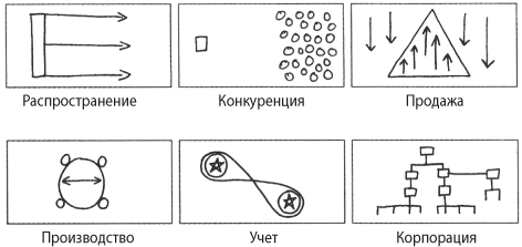 2. Опишите каждый вариант, нарисовав абстрактный графический символ. Каждый рисунок должен располагаться на отдельной карточке и соответствовать конкретному варианту. На обратной стороне карточки запишите этот вариант. Рисуйте на карточках разного цвета или разноцветными карандашами, чтобы различные компоненты можно было хорошо распознать. Например, можно рисовать символы, относящиеся к упаковке, на красных карточках, к распространению – на желтых, к маркетингу – на синих, к продаже – на белых.