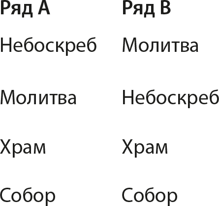 В следующем примере слова распределены по двум рядам – А и В, и участники эксперимента должны разрешить определенные ситуации. Когда первым шло слово «небоскреб», испытуемые начинали выдвигать архитектурные идеи, а когда «молитва» менялась местами с «небоскребом», становясь на первое место, мысли начинали идти скорее в религиозном направлении.