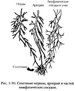 Сплетения появляются глубже, чем узлы. Они состоят из нервов, вен и сухожилии, которые переплелись между собой (рис. 5-30). Внутри этих сплетений могут находиться лимфатические узлы и жировые ткани. Частично они состоят из соединительной ткани, окружающей все органы и удерживающей их на месте. Эта ткань должна быть податливой, а органы должны сохранять возможность свободного перемещения. Когда на соединительной ткани появляются сплетения и она становится жесткой, она слишком крепко удерживает органы.