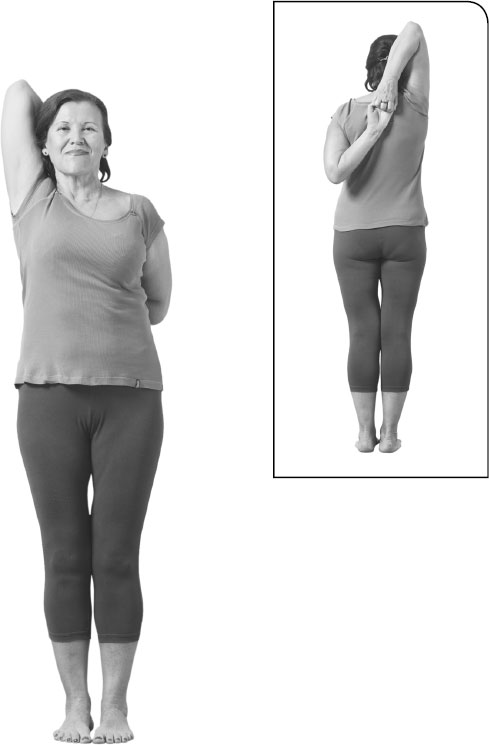 Встаньте в Тадасану. Вытяните правую руку вверх, разверните ее наружу в плечевом суставе, согните руку в локте и поместите тыльную поверхность правой ладони на спину между лопатками, разворачивая пальцы рук к потолку. Отведите правое плечо назад, чтобы грудная клетка не закрывалась. Поднимите вверх левую руку, согните ее в локте. Дотянитесь пальцами левой руки до пальцев правой, сцепите пальцы рук за спиной. Тяните левый локоть к потолку, а правый – к полу. Дышите спокойно. Останьтесь в позе 20–30 секунд. На выдохе расцепите пальцы рук и вытяните руки в Тадасане. Сделайте несколько спокойных дыханий и повторите асану, поднимая первой левую руку вверх.