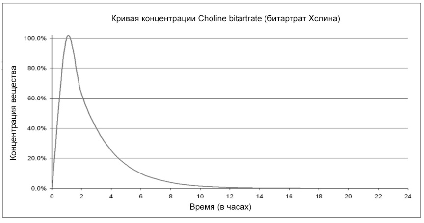 Кривая концентрации Холина битартрата. Время достижения максимальной концентрации в плазме = 1 часу, период полувыведения = 1,5 часам.
