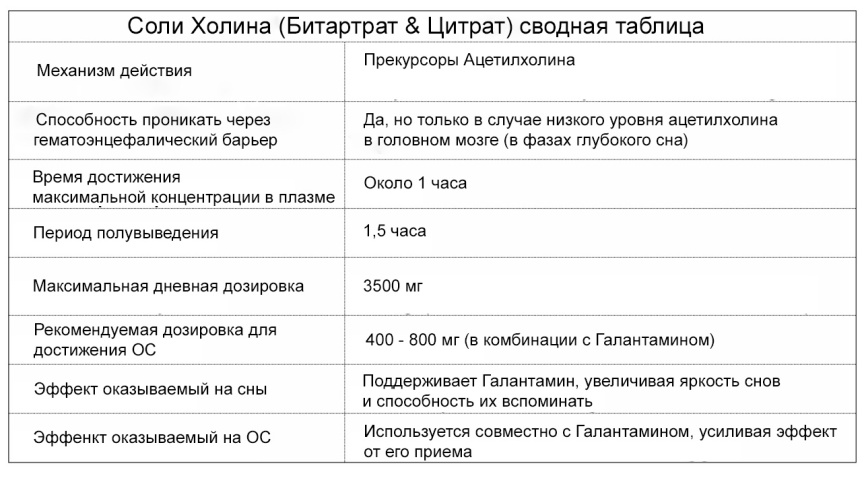 Вообще Холин считается ценным питательным веществом и рекомендованная суточная доза для женщин составляет 425 мг/день, а для мужчин 550 мг/день. Максимальной, безопасной, дневной дозировкой Холина является 3,5 грамма/день. Для усиления ОС 400-800 мг является достаточными. Я обычно использую 500 мг Холина битартрата в комбинации с 8 мг Галантамина.