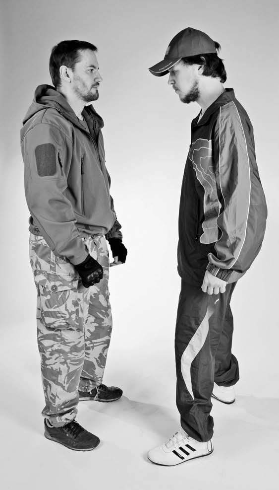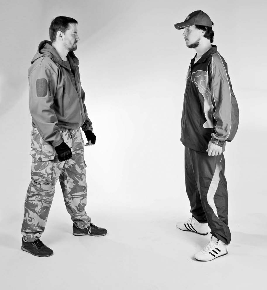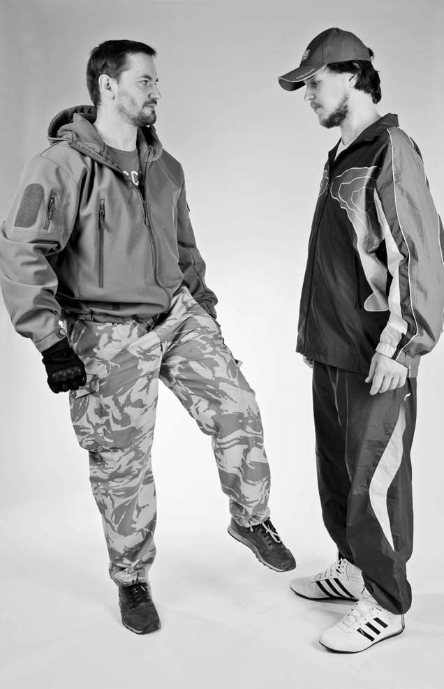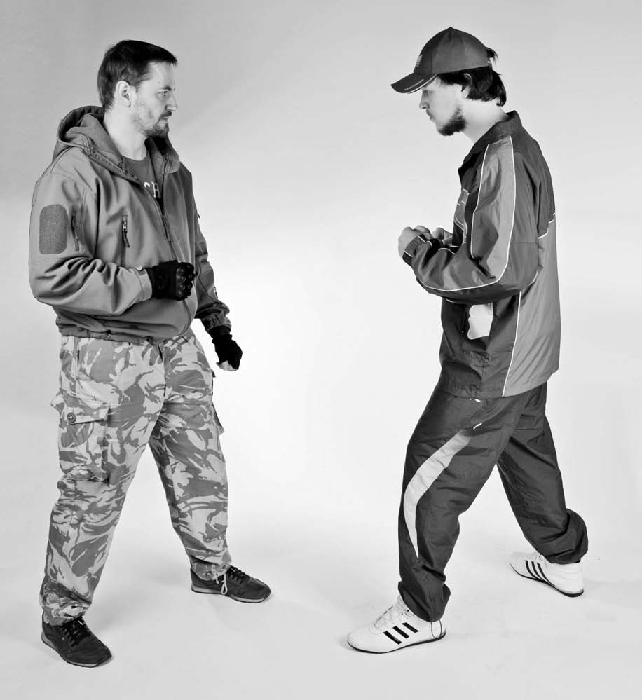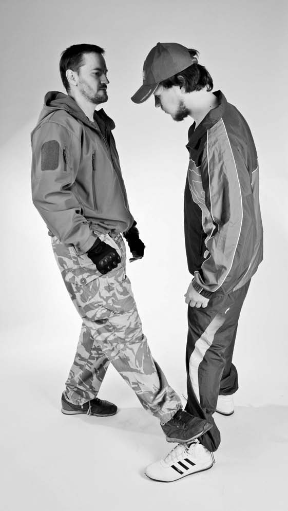 Пяткой по ноге противника – от голеностопа до колена включительно. Кости голеностопа (предплюсна, плюсна) тоже хрупкие – как и пястные кости, поэтому такой удар, ломающий эти косточки, может вызвать у противника сильный болевой эффект и обездвижить его. Противник при этом может находиться: