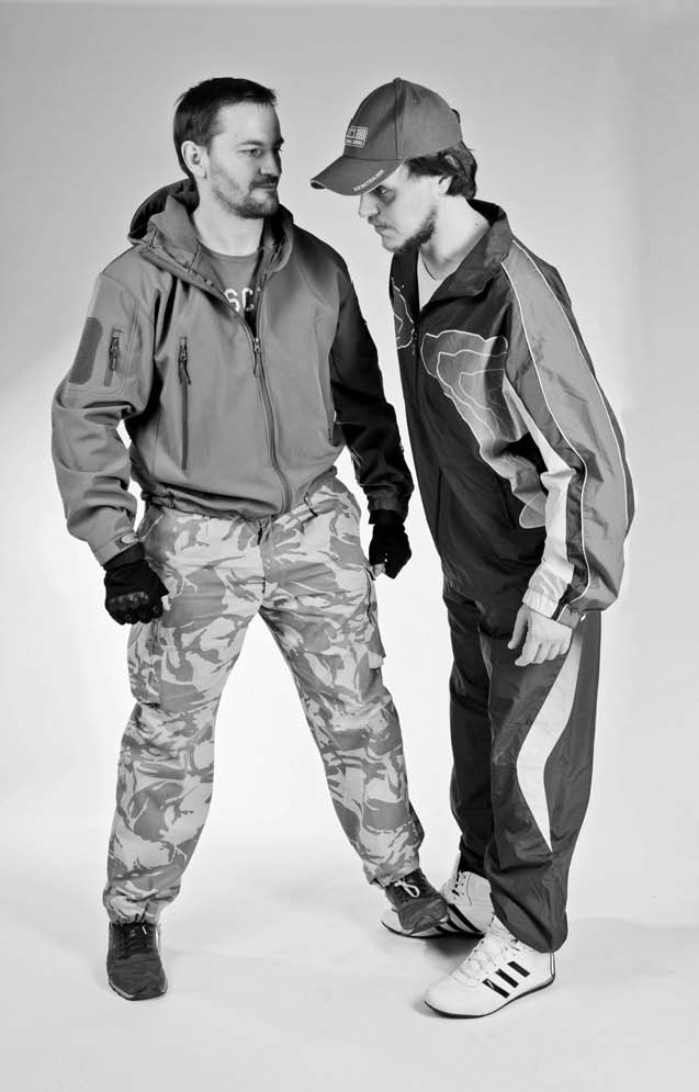 Удар боковой частью стопы по голени – это фронтальный удар, наносится по голени впереди стоящего противника. Степень ущерба зависит от вашей тренированности – от болезненного ощущения до перелома. Бьем не пальцами – потому что можно промахнуться или сломать пальцы, а серединой стопы – так же бьют по мячу в дворовом футболе (фото 54, 55).